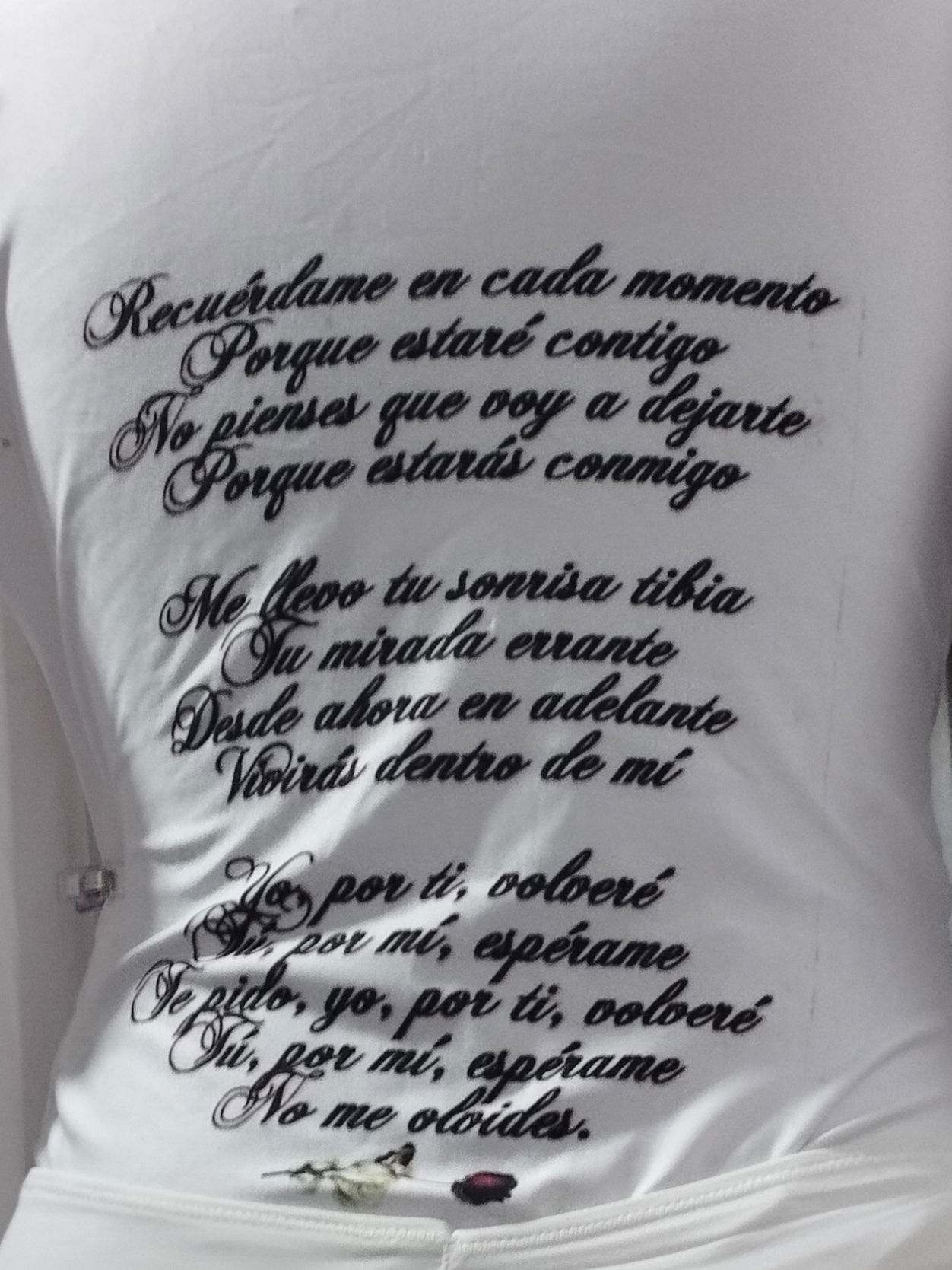 Campera al cuerpo con cierre con la letra de la canción No Es Mí Despedida de Gilda escrita en la espalda.. Material lycra